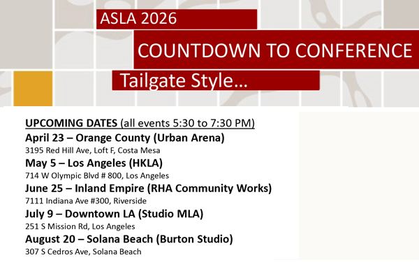 Join us for a series of casual mixers leading up to the ASLA 2026 Conference.Food & Drinks Provided!! Register here: https://www.div32.com/event-details/countdown-to-conference-orange-county